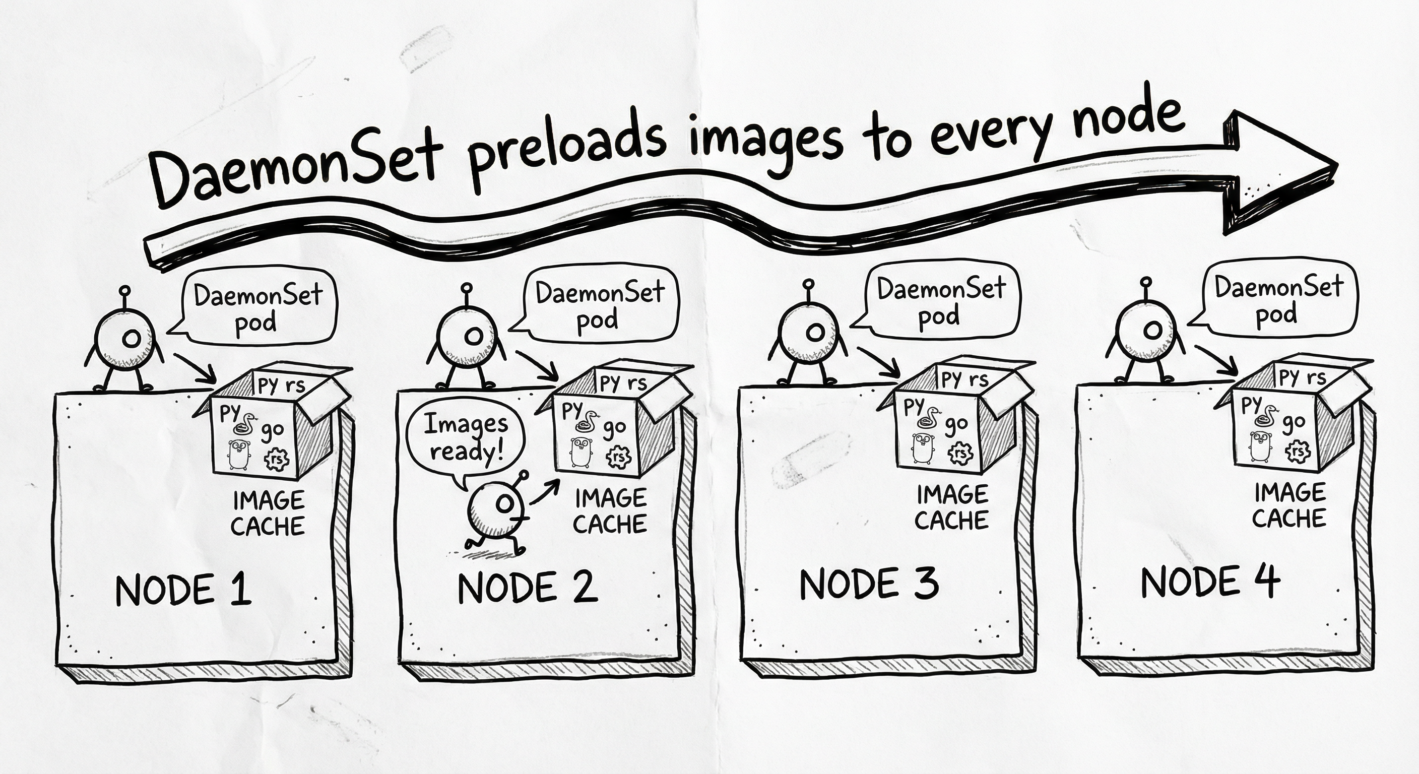 - The solution is simply to ensure the images are always available on every node by using a preloader DaemonSet