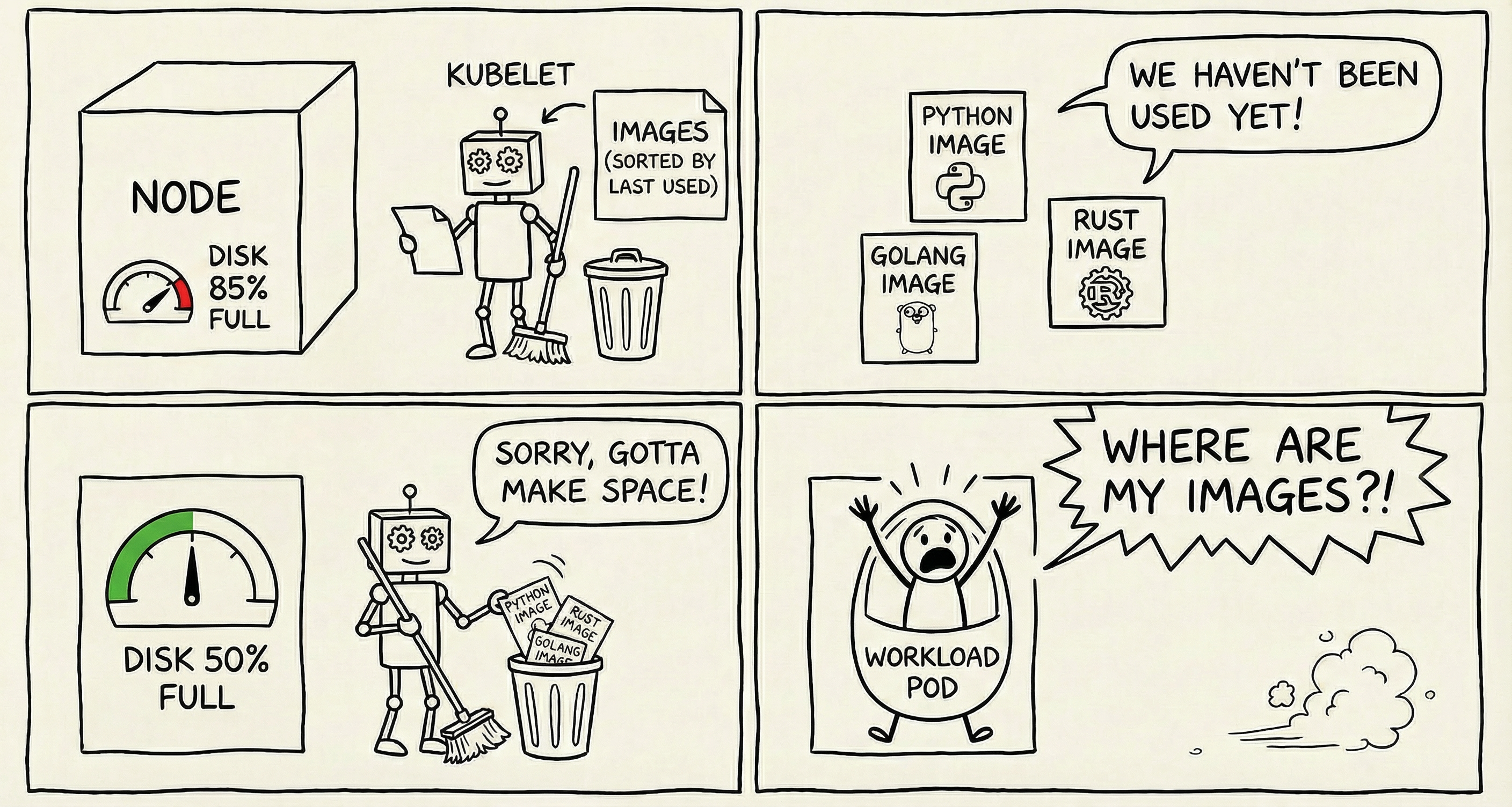 - When disk < 100%: Kubelet does nothing. Images stay forever.