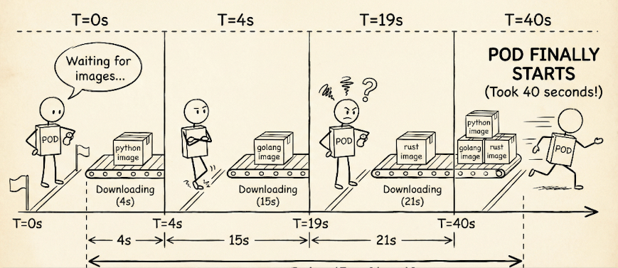 - Even worse, the images must be pulled one after the other and might even be blocked by other pods pulling images