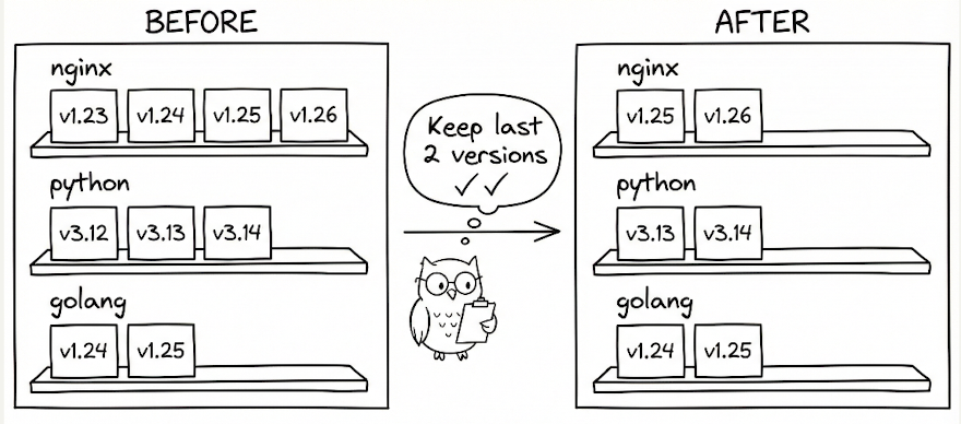- nginx:1.25, 1.26 ✓ (last 2 kept)