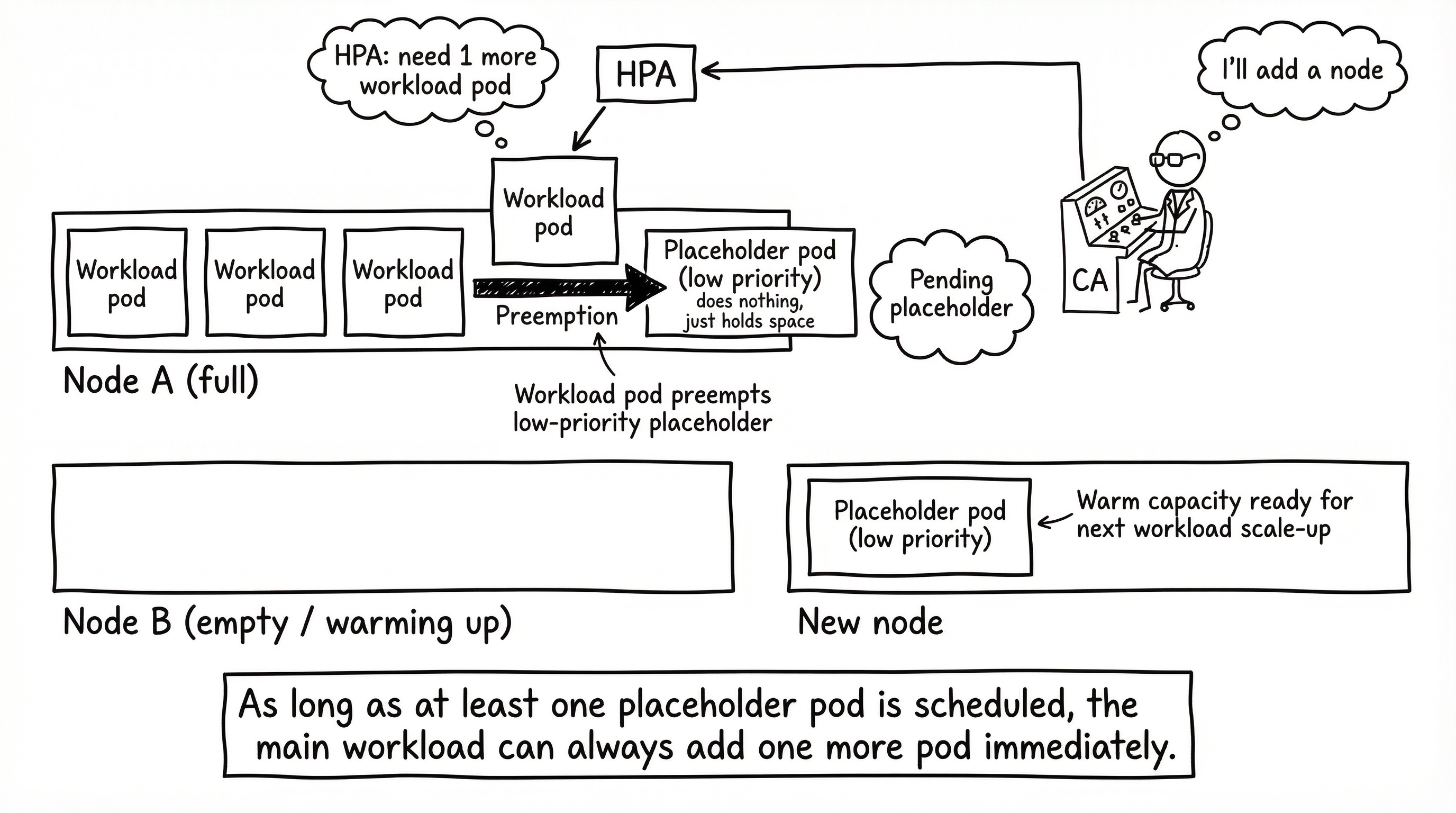 This solution ensures arbitrary extra capacity by creating low-priority pods that just sit there and take up space on a node. When the HPA scales up our workload deployment and a new pod needs a node it can always bump a low-priority placeholder pod, which will become unscheduled. The cluster autoscaler will at this point start to provision a new node for the displaced placeholder pod, which is fine because the placeholder’s job is just keep a warm node ready for the workload pods. As long as you have at least one scheduled placeholder pod the main workload deployment can always add one more pod immediately.
