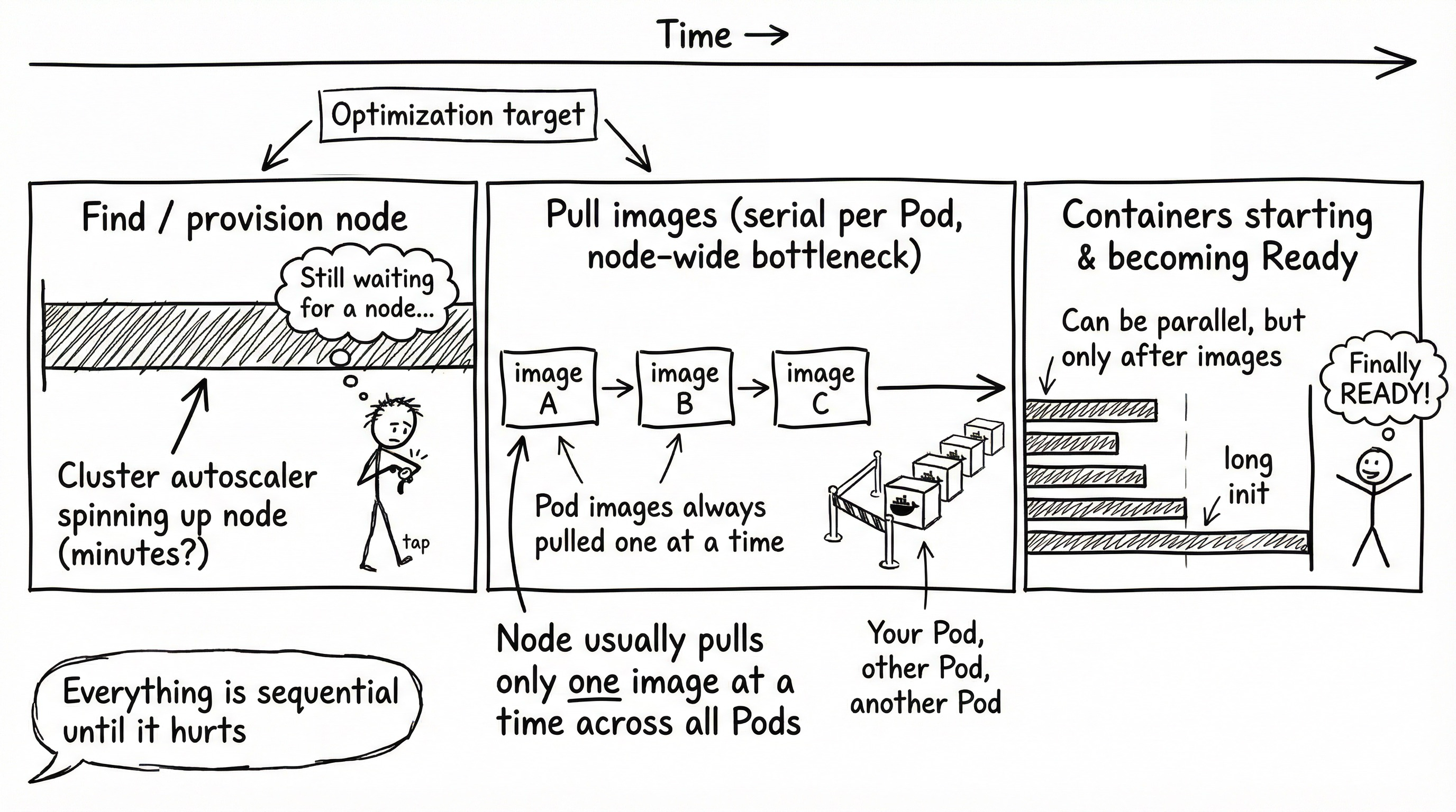 All of them take time. If you need to provision a new node, it can take minutes. If the node doesn’t have the images you need you can spend a long time pulling images. Finally, if a container in your pod has a long initialization sequence it adds up. Note that all these happen in a sequence, so they add up. Multiple containers can get ready in parallel, but they have to wait for a node to be available first and only then the images can be pulled.