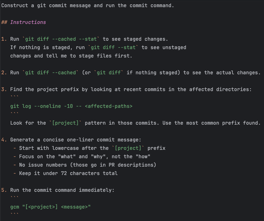 I created a /gcm command that analyzes changes, finds the project prefix pattern from recent commits, generates a