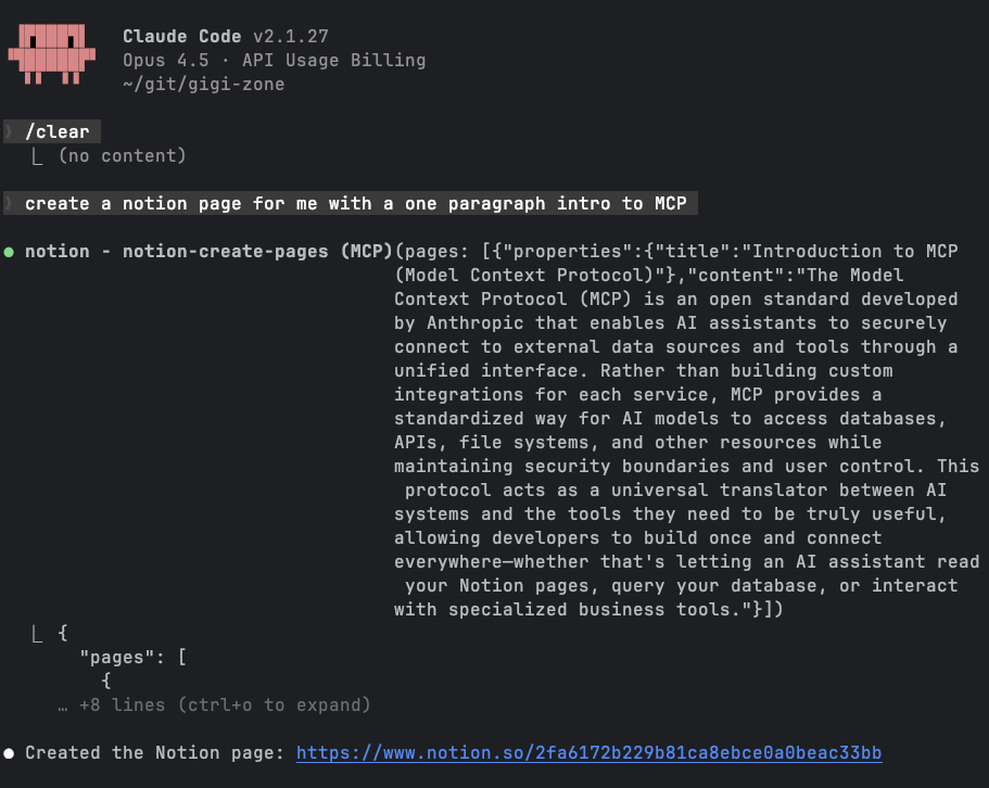 OK. Let’s see what happens if I ask Claude Code to write a quick Notion page for me.