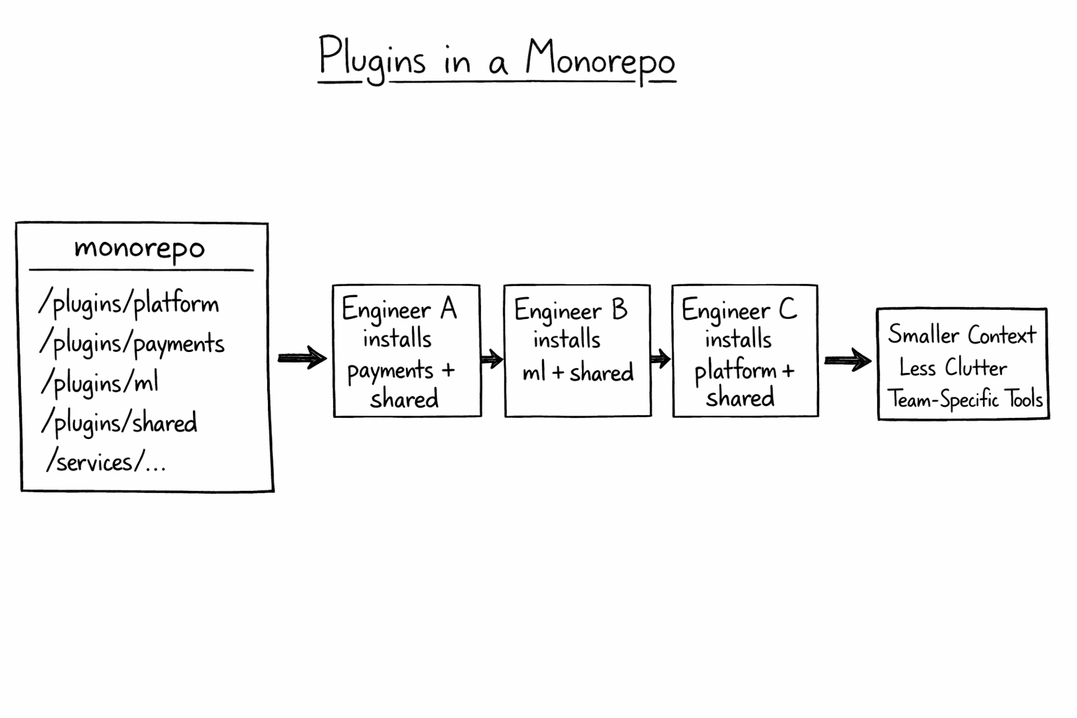 That model is the practical pattern: shared plugin inventory, team-specific installs, and less context clutter per engineer.