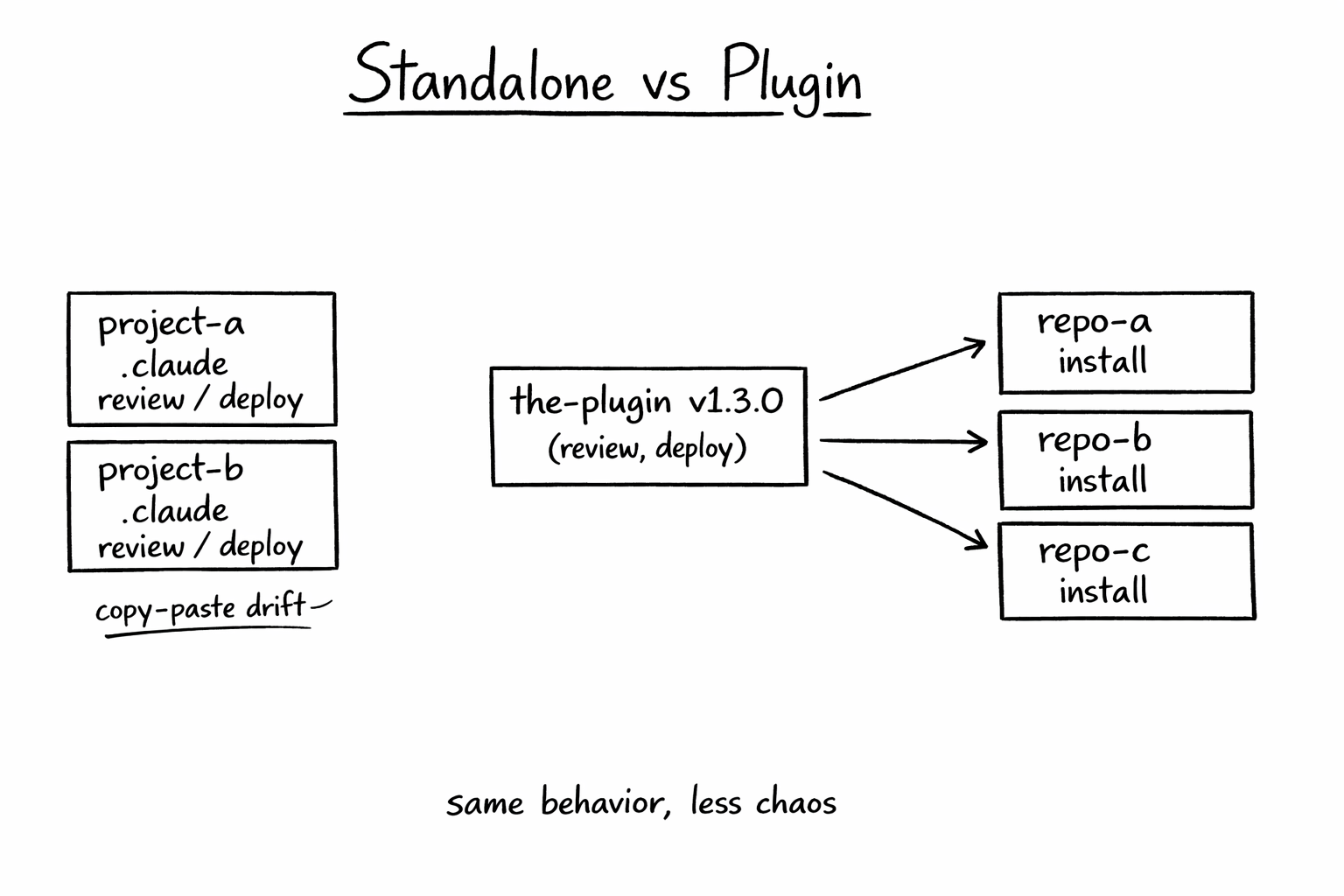 /hello; plugin uses/the-plugin:hello. - Scope: standalone is usually one project; plugins are meant for multiple projects and teams.