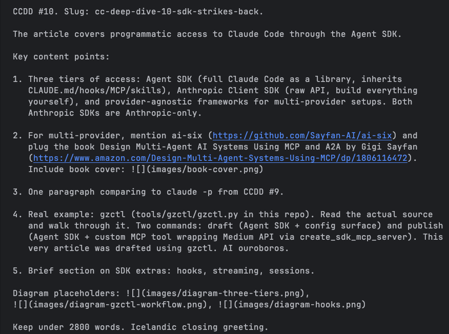 Running Claude Code at the terminal is awesome 💻. Running it headless in CI is powerful 🚀. But the real leverage comes when you embed Claude Code directly in your own code. The Claude Agent SDK turns the full Claude Code machinery into a Python library 🐍 (there is a TypeScript SDK too). You have the entire Claude Code ecosystem at your fingertips (if you’re still typing that is 😉). In this CCDD article we will explore the Claude Agent SDK, compare it to the Anthropic Client SDK and build a useful CLI program using the Claude Agent SDK to help me manage the Gigi Zone blog. The customary quote is coming for the first time from Claude itself! I couldn’t find a better quote from a real person 🤖.