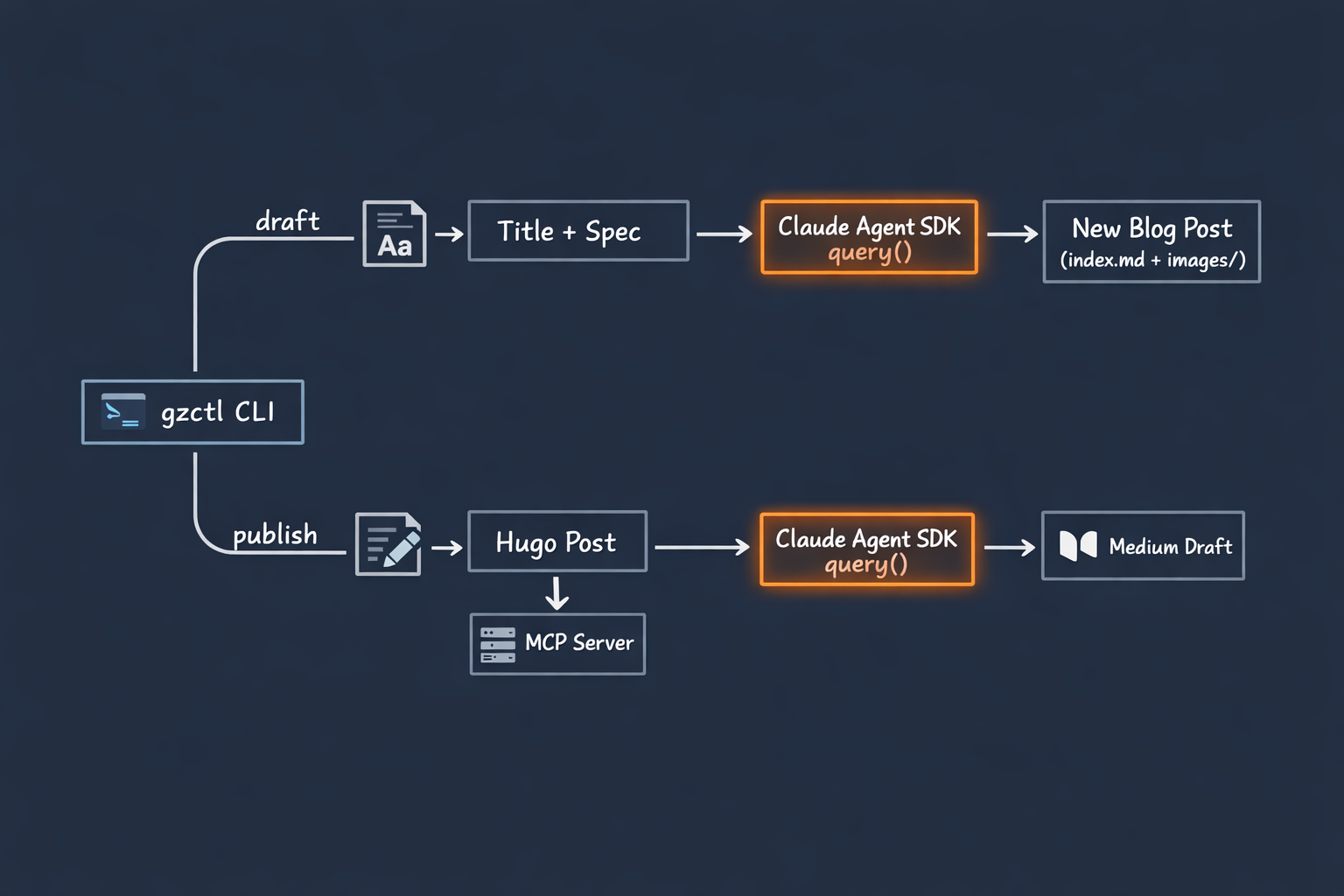 The publish command is a two-step pipeline. First, Claude converts the Hugo post to Medium-ready markdown. Then, an in-process MCP server handles the actual Medium API call.