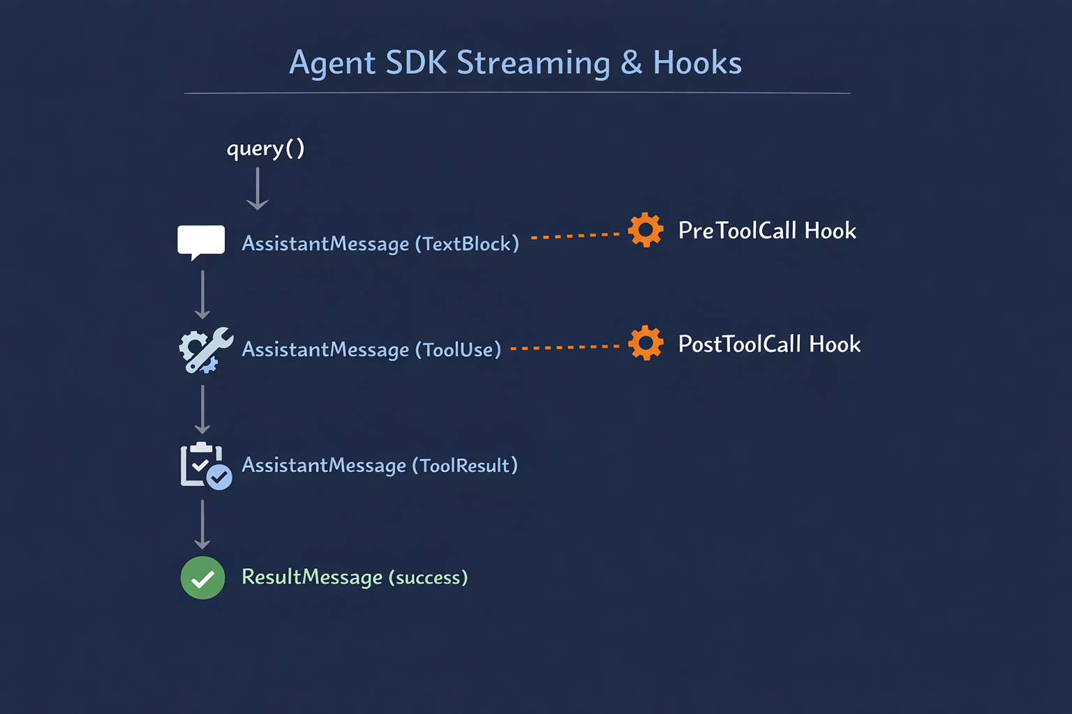 Streaming is built into the async for loop you have already seen. Each yielded message is typed: AssistantMessage for output during the task, ResultMessage for the final outcome. Content blocks within AssistantMessage can be TextBlock for prose, or tool-call and tool-result blocks for structured interactions. The typed stream lets you log tool usage, display progress indicators, or route different message types to different outputs without parsing raw text.