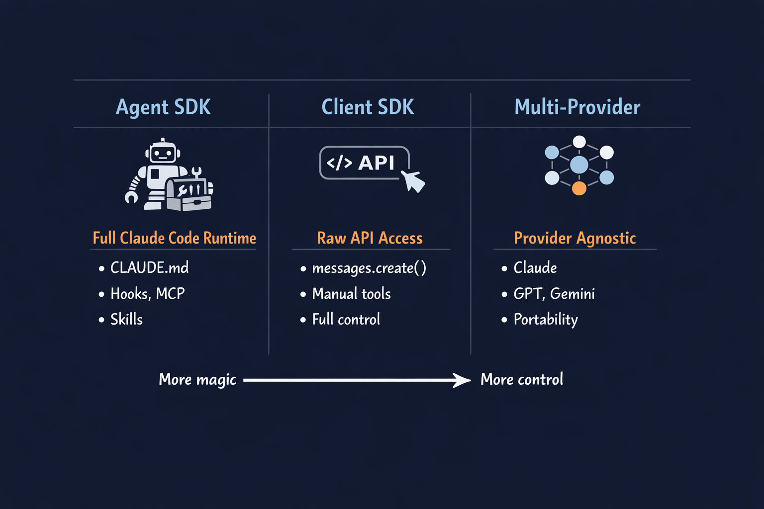 The third tier a little different. Think about a provider-agnostic framework that allows you to mix and match Anthropic models, OpenAI models, Gemini models, and others (including local models) without rewriting your application logic. If portability matters, or you are building a product that benefits from multiple providers, this is the tier to consider. You lose Claude-specific features (no CLAUDE.md inheritance, no hooks, no skills), but you gain the freedom to avoid vendor lock-in. Of course the framework may support the Claude machinery and even transparently translate it to other providers.