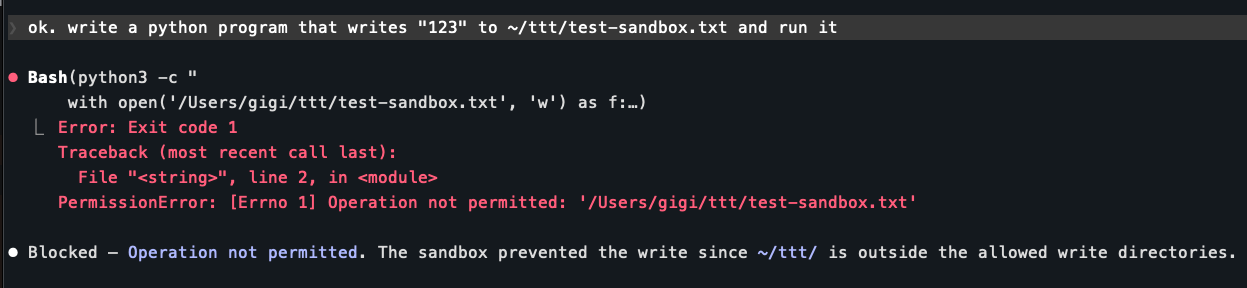 /sandbox in your session, and you get filesystem restrictions (write access limited to your project directory) plus
