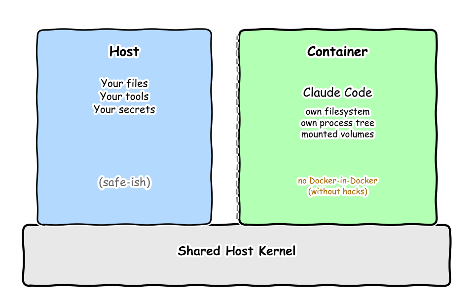 Run Claude Code inside a Docker container. You get namespace and cgroup isolation: a separate filesystem view, process tree, and resource limits. But you’re still sharing the host kernel, and giving Claude access to Docker inside the container (Docker-in-Docker) is a security headache. The agent also can’t easily use host tools or configurations.