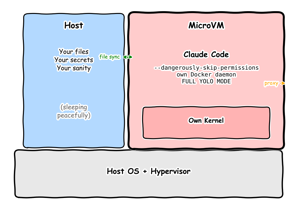 Containers still share the host kernel, though. For real isolation, you need your own kernel, and that’s exactly what Docker Sandboxes provide.