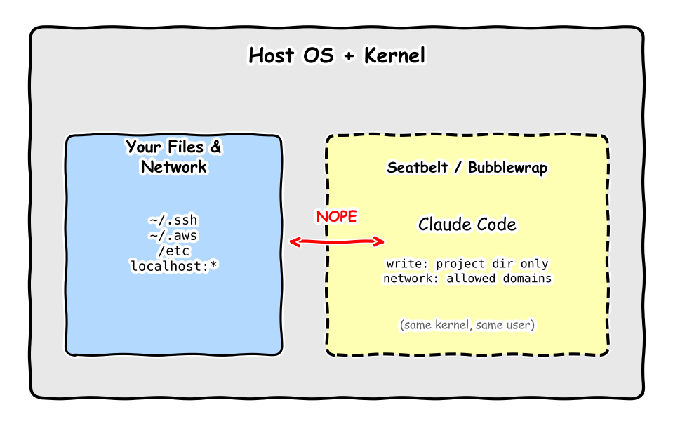 The limitation is that it’s process-level isolation. You’re still sharing the host kernel. A kernel exploit (unlikely but not impossible) could escape. And some tools just don’t work inside it: Docker commands, watchman, and anything that needs low-level system access may need to be excluded.