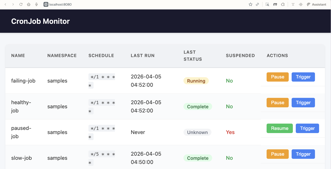 All four sample CronJobs showing up with their correct statuses. The healthy-job shows “Complete,” the failing-job shows “Running” (it was mid-execution), the paused-job shows “Unknown” with “Suspended: Yes” and a “Resume” button instead of “Pause,” and the slow-job shows “Complete” from its last run. The Pause, Resume, and Trigger buttons use HTMX to swap row fragments inline without full page reloads.