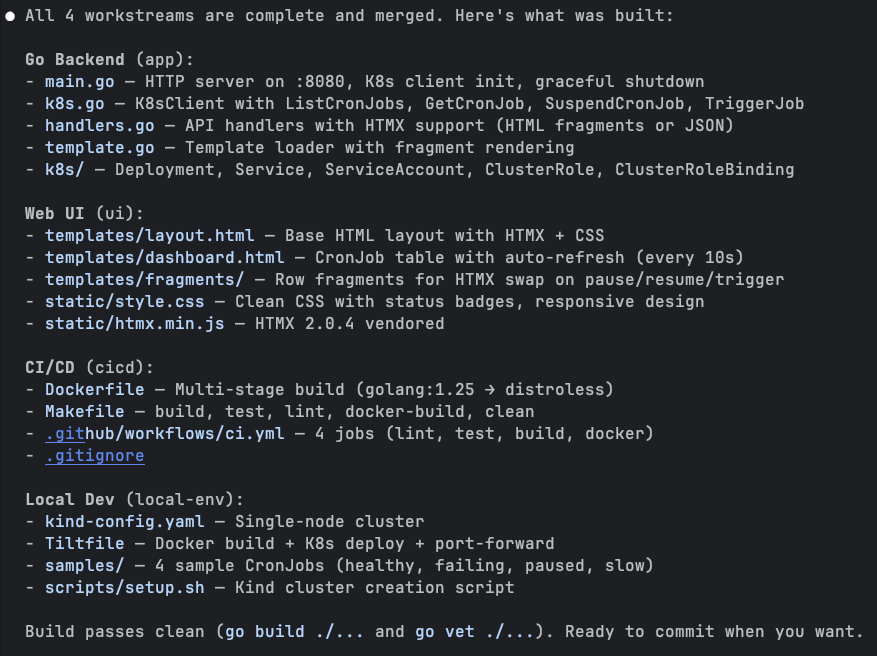 Four workstreams, dozens of files, all merged cleanly. The Go backend had main.go, k8s.go (the client-go wrapper), handlers.go (API endpoints with HTMX support), and template.go. The UI had a base layout, dashboard template, and row fragments for HTMX swaps. CI/CD had a multi-stage Dockerfile, a Makefile with all the standard targets, and a GitHub Actions workflow with 4 jobs. Local dev had the kind config, Tiltfile, 4 sample CronJobs, and a setup script. Build passed clean on the first try.