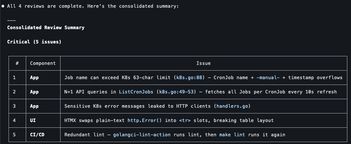 Real issues across components: K8s name length limits, N+1 API queries, leaked error messages, broken HTMX table swaps, redundant linting. Four reviewers, each focused on their area of expertise, coordinated by one lead that synthesized the results. This is agent teams in a nutshell.