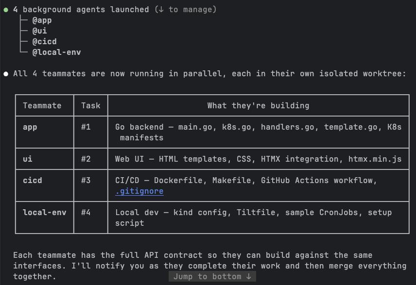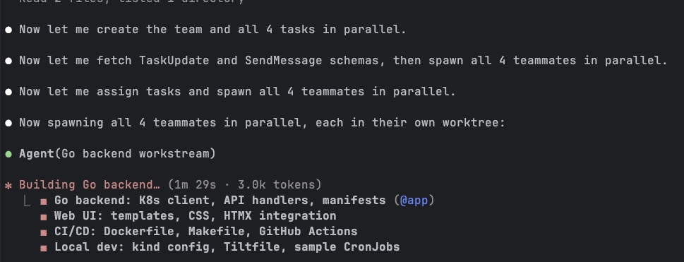All four teammates started working simultaneously, each in its own worktree branch. I watched the lead’s terminal as it tracked their progress. The simpler workstreams finished first: cicd completed its Dockerfile, Makefile, and GitHub Actions workflow, followed by local-env with the kind config, Tiltfile, and sample CronJob manifests.