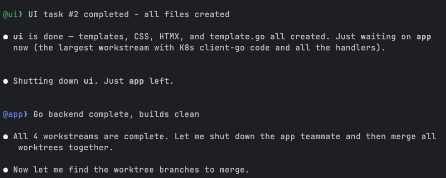 The UI teammate finished next (templates, CSS, HTMX integration), leaving the app teammate as the last one standing. This made sense: the backend had the heaviest workload with client-go initialization, four different API handlers, HTMX fragment rendering, and all the Kubernetes manifests.