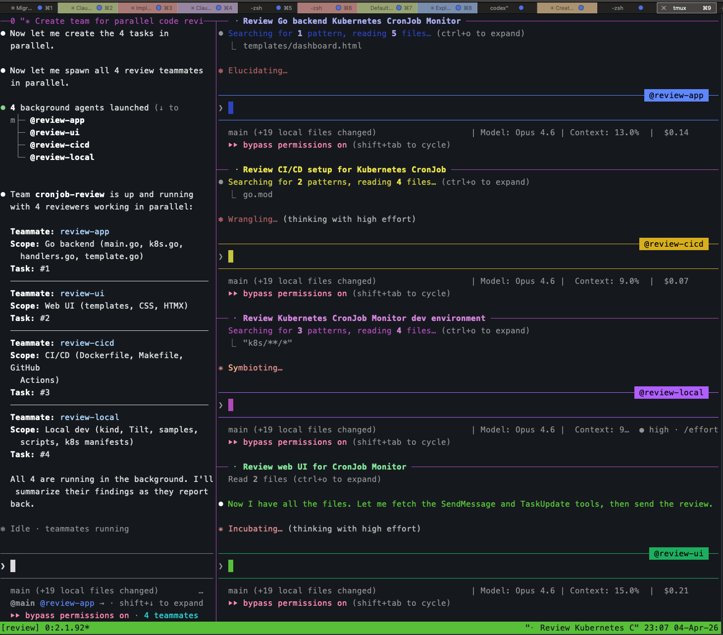 Here’s what that looks like with four teammates running a code review in parallel, each in its own pane: