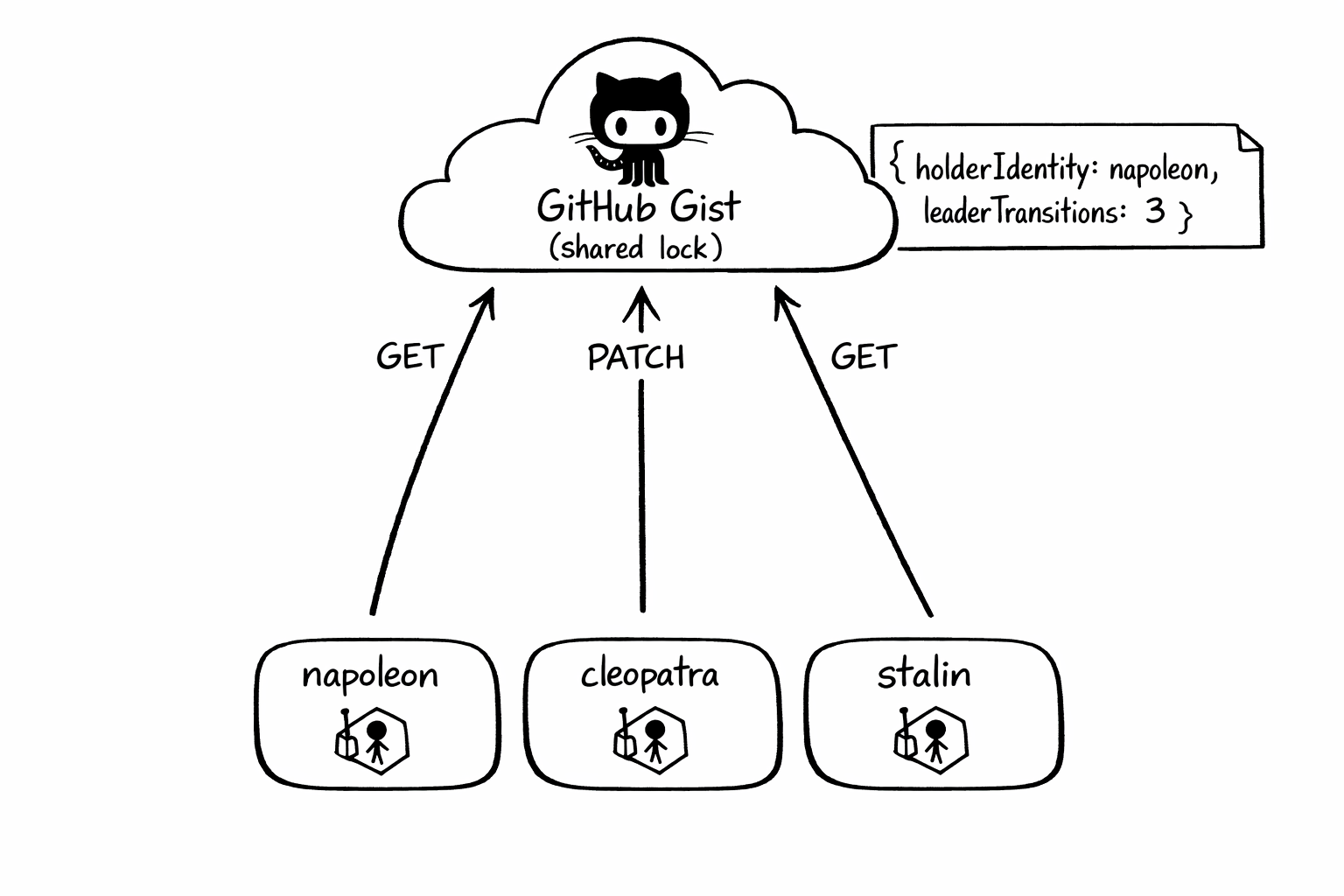 The implementation is almost embarrassingly small. Get fetches the Gist, parses the JSON, returns the record. Update PATCHes new JSON. Create is Update with no preconditions. Because Gist updates are last-writer-wins, the example re-reads after takeover attempts to detect races after the fact. Again: great for demonstrating the shape of a custom lock, not the semantics you want in production. The state stored in the Gist is still the same JSON that LeaseLock stores in a Lease object, because the structure comes from the leaderelection package itself.