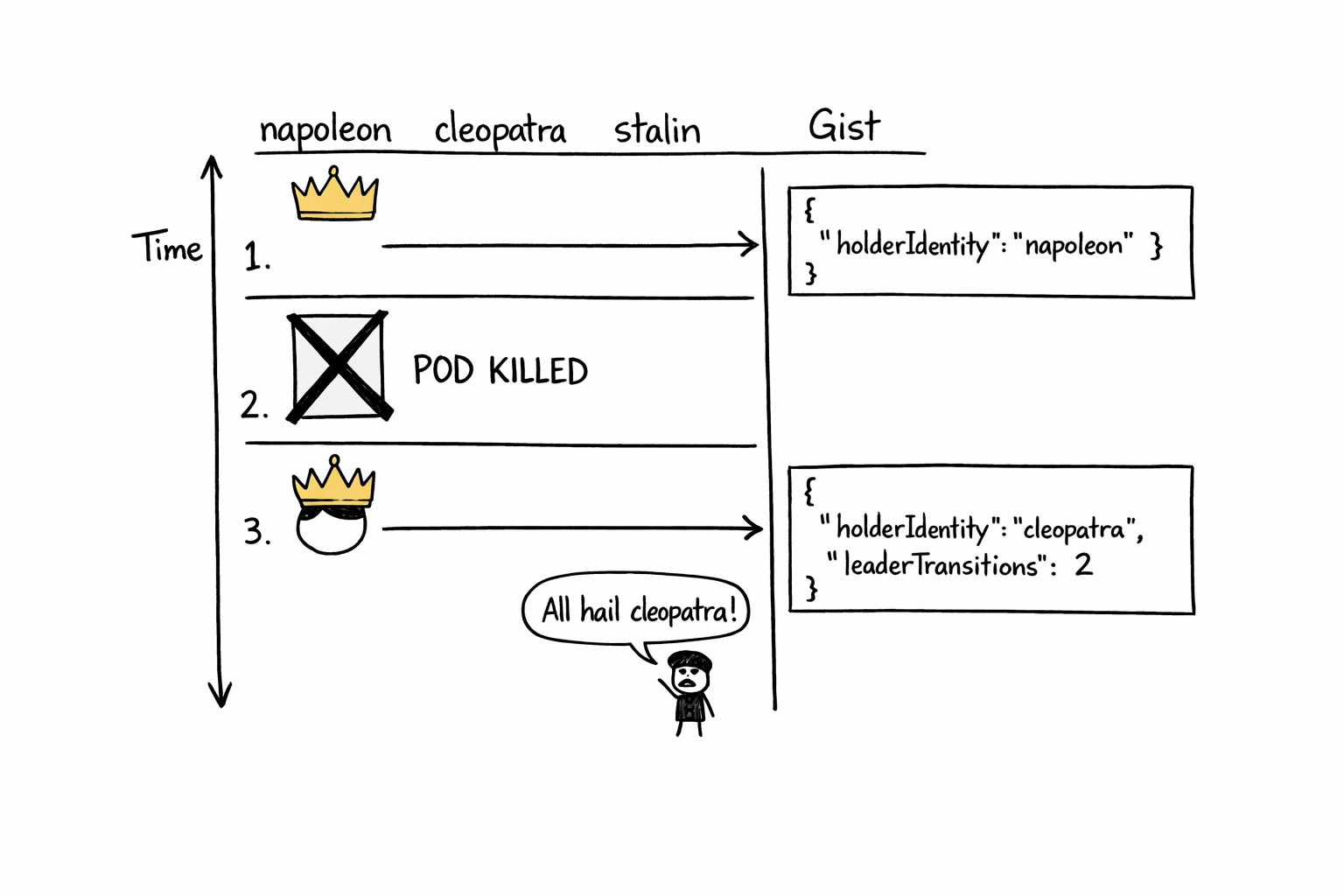 Stalin stops renewing. The lease keeps being “valid” until LeaseDuration seconds past the last renewal. Napoleon and cleopatra keep polling. The instant the lease expires, whichever of them is next to poll notices, tries to write itself as the new holder, and one wins.