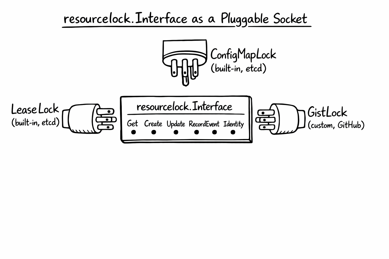The built-in implementations (LeaseLock, ConfigMapLock, EndpointsLock) store their coordination state in Kubernetes objects, and in a typical cluster those objects live in etcd-backed storage behind the API server. But the interface itself does not know about etcd. It does not know about Kubernetes. It is just Get, Create, Update against some shared place to store a small JSON record.