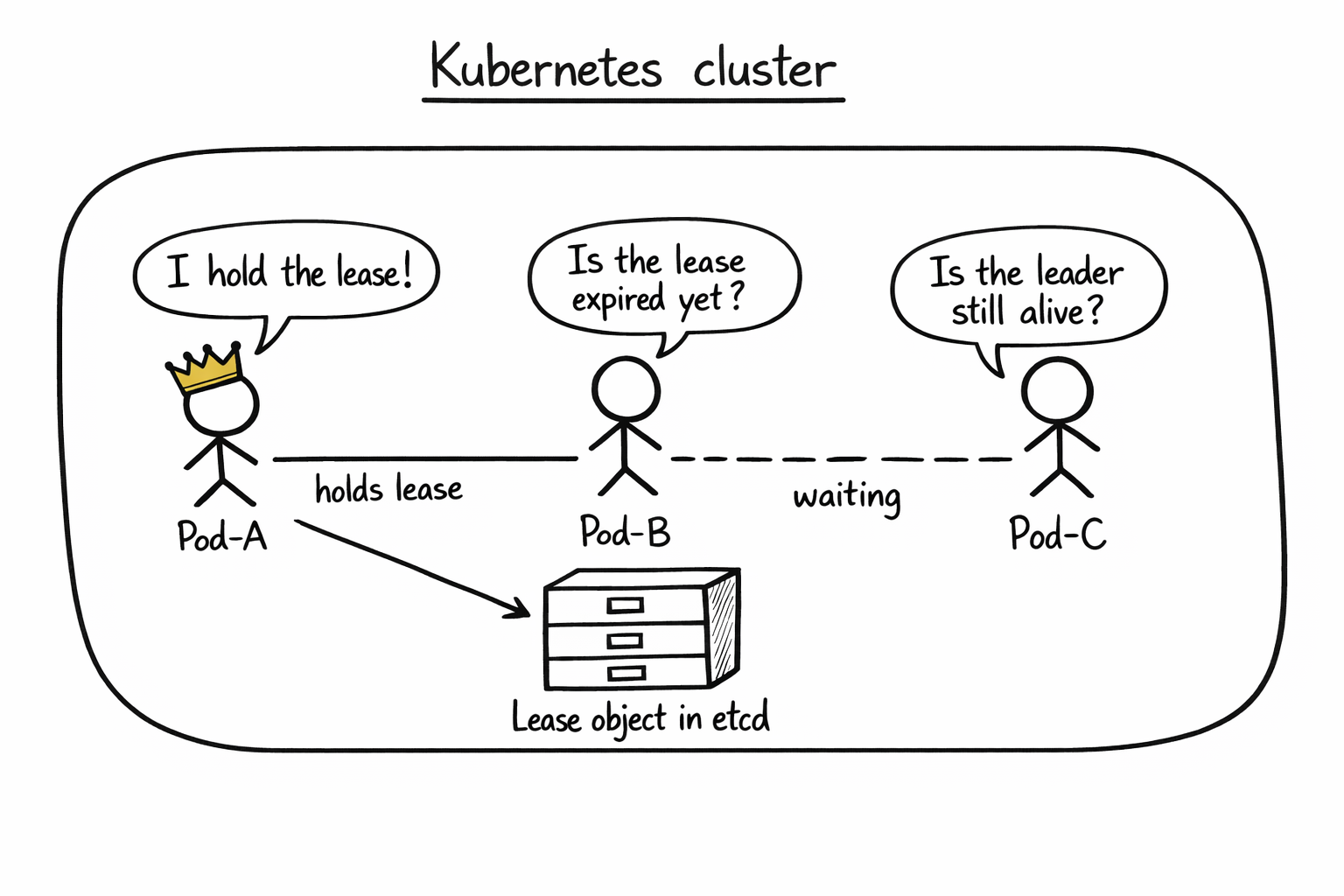 Three pods all run the same code. They all ask Kubernetes “who is the leader?”, which really means “let me read this Lease object through the API server”. If no one holds a valid lease, one of them wins an optimistic-concurrency update to become leader and starts doing work. It keeps renewing the lease on a timer. If the leader dies and stops renewing, the lease expires, and one of the standbys grabs it on the next poll.