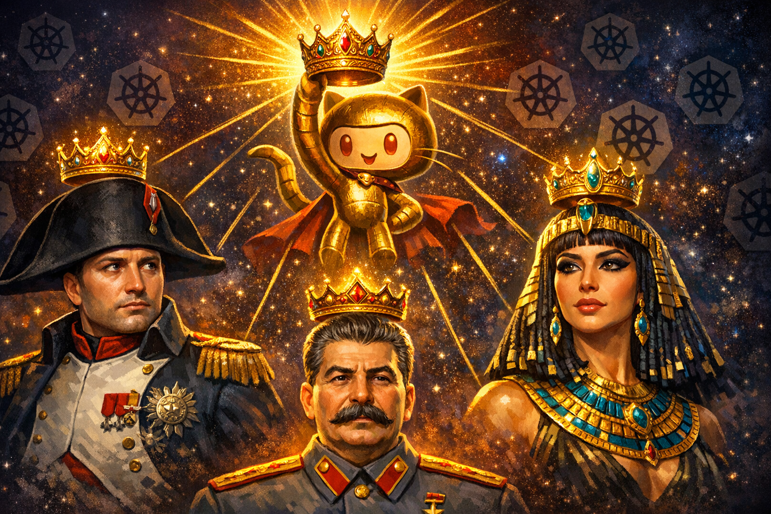 The full demo is in the leader-election repo. It uses vcluster to spin up three virtual Kubernetes clusters inside a single kind cluster, which makes the “multi-cluster” part fast and cheap on a laptop. Each virtual cluster runs the same leader-elector pod, named after a world-historical figure with strong opinions about being in charge: Napoleon, Cleopatra and Stalin.